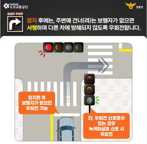 그리고 정지 후에는 주변에 건너거나 건너려는 보행자가 없으면 서행하면서, 신호에 따라 진행하는 다른 차마의 교통을 방해하지 않고 우회전 할 수 있습니다.