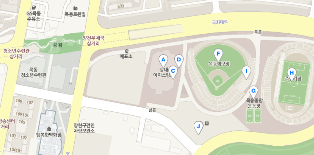 목동 실내 아이스링크는 목동양구장, 목동종합운동장, 목동주경기장이 함께 모여있습니다.