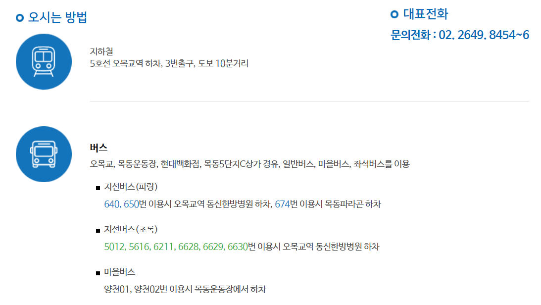 지하철 이용시에는 5호선 오목교역에서 하차 후 3번출구로 나와서 도보 10분거리에 있습니다.