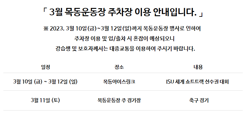 쇼트트랙 세계선수권대회가 열리는 3월10일~3월 12일에는 특히 혼잡이 예상됩니다. 특히 3월11일에는 목동 주경기장에서 축구경기도 있을 예정이니 미리 참고해주세요.