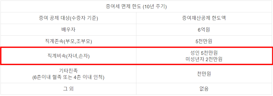 직계비속(자녀,손자) | 성인 5천만원 미성년자 2천만원 |